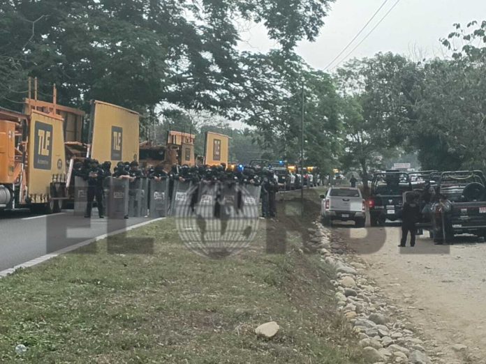 Huixtla, Chiapas, 19 de abril de 2026.— La situación en la carretera federal que atraviesa el municipio de Villacomaltitlán se ha tornado tensa la tarde de este domingo, luego de que decenas de elementos de seguridad estatal arribaran al punto del bloqueo donde pobladores mantienen cerrada la vía en ambos sentidos.