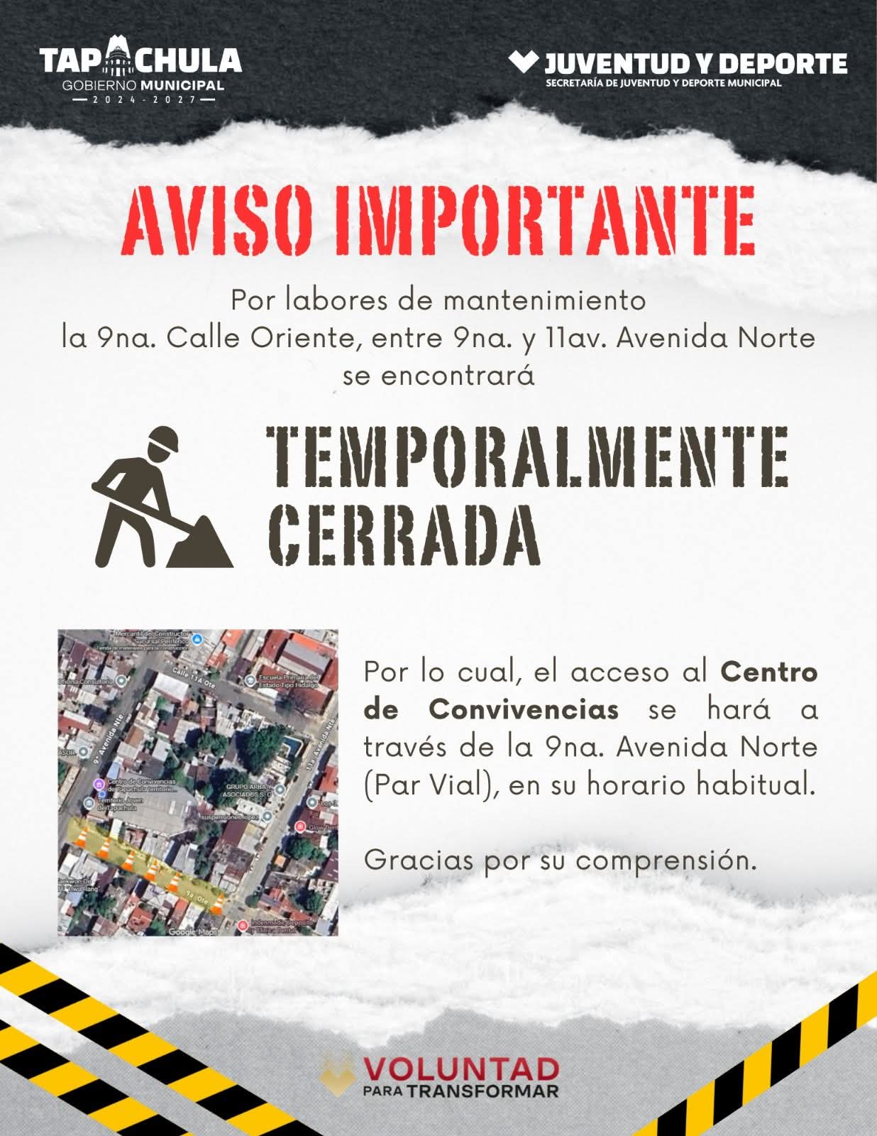 El Ayuntamiento de Tapachula a través de la Secretaría de Obras Públicas informa a la ciudadanía n general que debido a trabajos de mantenimiento la 9a. calle Oriente entre 9a. y 11a. avenida Norte, PERMANECERÁ CERRADA TEMPORALMENTE.