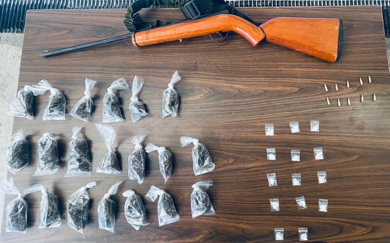 Derivado de la revisión, se le aseguraron 14 dosis de sustancia con características propias de la droga conocida como cristal, 20 dosis de hierba verde con características de marihuana, un arma de fuego tipo rifle calibre .22, así como 10 cartuchos útiles del mismo calibre.