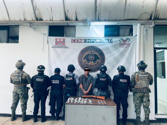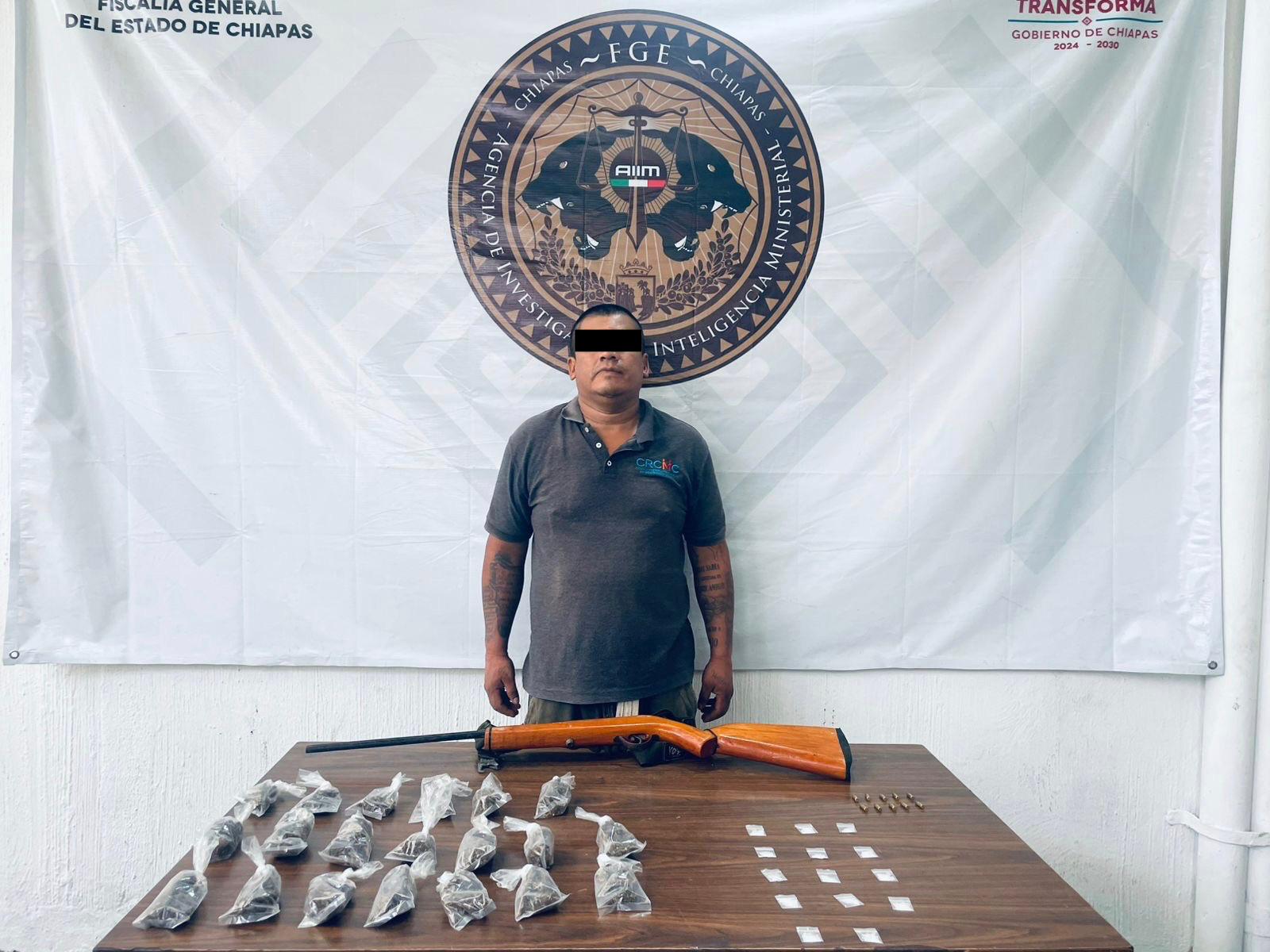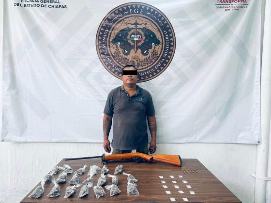 La Secretaría de Seguridad del Pueblo (SSP), a través de la Fuerza de Reacción Inmediata Pakal (FRIP), Guardia Estatal Preventiva (GEP), Guardia Estatal Fronteriza (GEF), en coordinación con la Agencia de Inteligencia e Investigación Ministerial (AIIM), de la Fiscalía General del Estado (FGE), Secretaría de Marina (Marina) y la Policía Municipal, lograron la detención de una persona del sexo masculino por su probable responsabilidad en la comisión de delitos contra la salud y portación de arma de fuego, en el municipio de Tapachula.