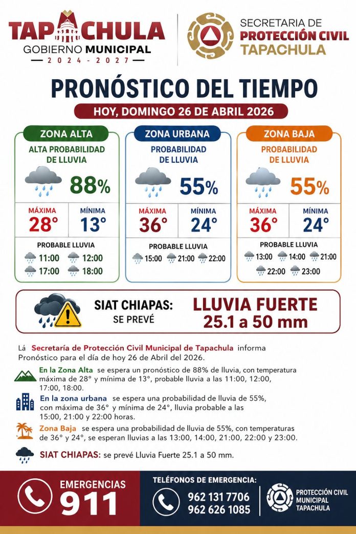 La Secretaría de Protección Civil Municipal de Tapachula informa Pronóstico para el día de hoy 26 de Abril del 2026.