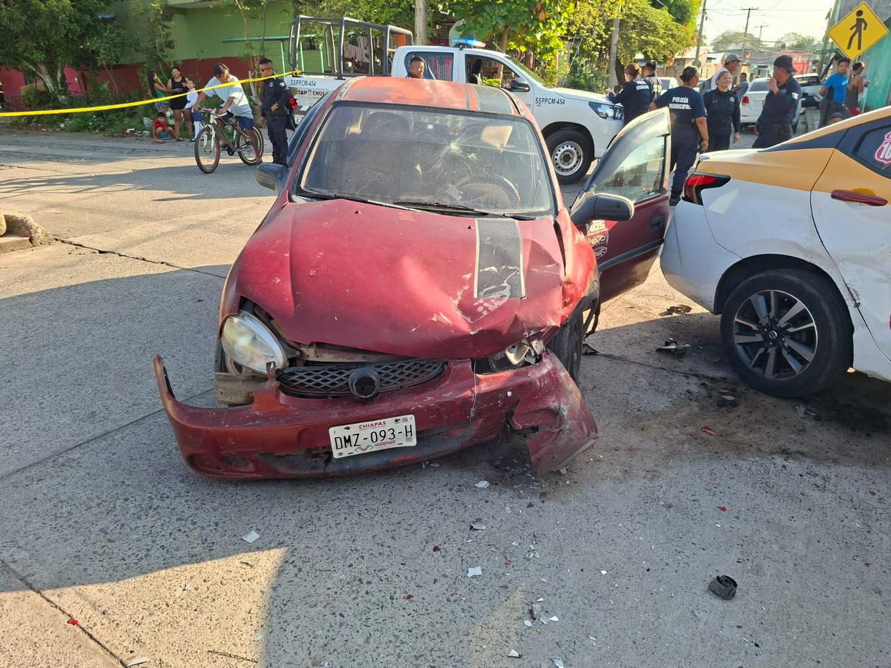 De acuerdo con información recabada en el lugar, el accidente involucró a un taxi local Nissan Versa, con número económico 2037, y un vehículo Chevrolet Chevy Pop color vino. De manera preliminar, se indicó que el taxi circulaba presuntamente a exceso de velocidad de norte a sur, impactando por la parte trasera al automóvil particular, el cual fue proyectado varios metros, resultando con daños severos en toda su estructura.