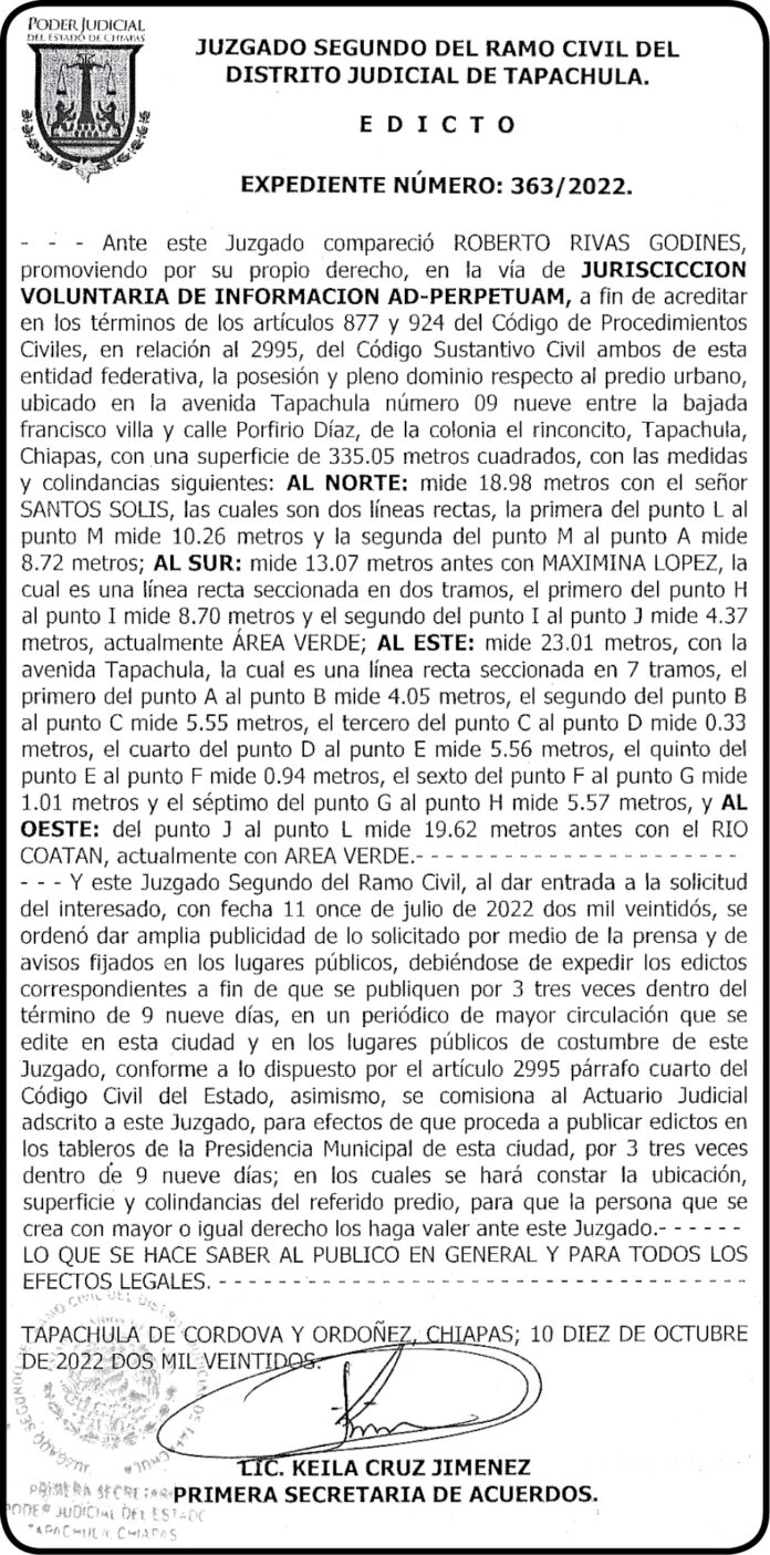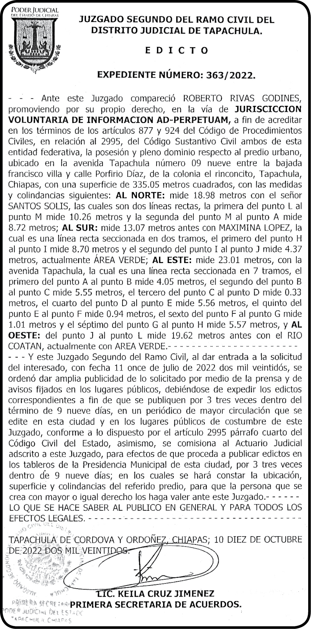 InicioAviso EficazEdictosEdicto 363-2022 Edictos Edicto 363-2022 17 octubre, 2022 0 1032 Cuota FacebookTwitterPinterestWhatsAppEmail Edicto 363-2022 Cuota FacebookTwitterPinterestWhatsAppEmail Artículo anteriorOCTUBRE 17 DE 2022Artículo siguienteEdicto 744-2021 RELATED ARTICLES Edictos Edicto 556-2023 11 octubre, 2023 Edictos Aviso Luvia Perez Galvez 11 octubre, 2023 Edictos Edicto 1174-2021 10 octubre, 2023 EL ORBE AL MOMENTO: Recorrido por el malecón en la colonia Obrera: Yamil Melgar Al Instante staff - 18 diciembre, 2025 0 El presidente municipal Yamil Melgar, junto a los secretarios de Seguridad Pública y SEDURBE, llevó a cabo un recorrido por el malecón en la... Leer más Conferencia de prensa matutina. Jueves 18 de diciembre 2025 | Presidenta Claudia Sheinbaum Pardo Al Instante staff - 18 diciembre, 2025 0 Te invitamos a seguir la transmisión en vivo de la conferencia matutina: #MañaneradelPueblo, encabezada por la Dra. Claudia Sheinbaum Pardo, Presidenta Constitucional de los... Leer más ¡Gran Final hoy el Campo Córdova Uno! Al Instante staff - 18 diciembre, 2025 0 Tapachula, Chiapas.-Hoy en punto de las 15:30 horas, se jugará la gran final del Torneo Decembrino 2025, en el campo Córdova Uno, en la... Leer más Cargar más MAS Popular Recorrido por el malecón en la colonia Obrera: Yamil Melgar 18 diciembre, 2025 México se Mantiene Entre los Mayores Exportadores de Alimentos 18 diciembre, 2025 Mexicanos Gastarán 4 mil Pesos en Cena Navideña Este 2025 18 diciembre, 2025 Conferencia de prensa matutina. Jueves 18 de diciembre 2025 | Presidenta Claudia Sheinbaum Pardo 18 diciembre, 2025 Cargar más