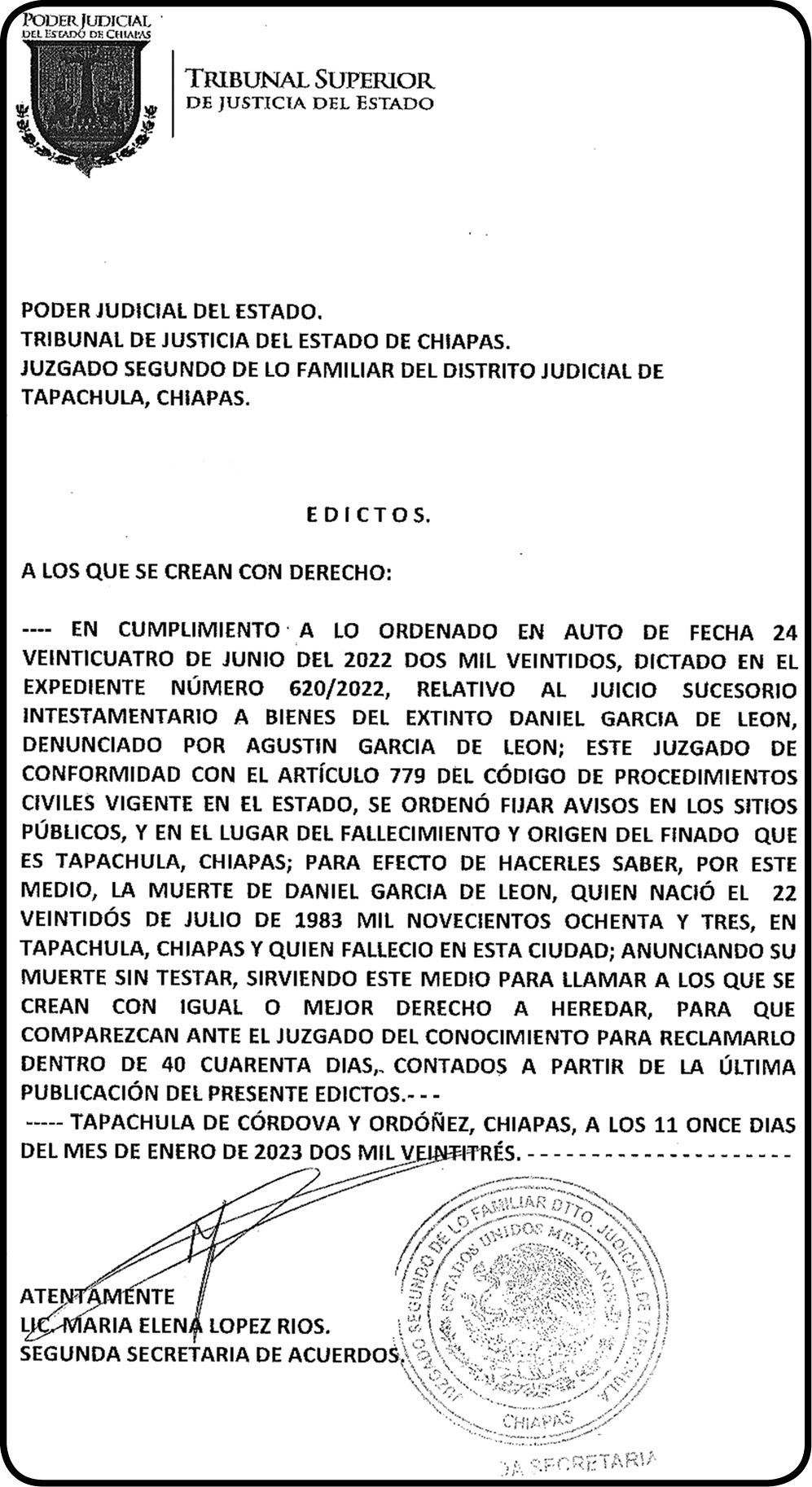 InicioAviso EficazEdictosEdicto 620-2022 Edictos Edicto 620-2022 14 febrero, 2023 0 1145 Cuota FacebookTwitterPinterestWhatsAppEmail Cuota FacebookTwitterPinterestWhatsAppEmail Artículo anteriorEdicto 580-2022Artículo siguienteHORÓSCOPO RELATED ARTICLES Edictos Edicto 556-2023 11 octubre, 2023 Edictos Aviso Luvia Perez Galvez 11 octubre, 2023 Edictos Edicto 1174-2021 10 octubre, 2023 EL ORBE AL MOMENTO: SE APLICARÁN SANCIONES A QUIEN TIRE BASURA EN LA VÍA PÚBLICA EN TAPACHULA. Al Instante staff - 12 enero, 2026 0 12 de enero 2026, Tapachula, Chiapas.- El Ayuntamiento de Tapachula recordó a la población que tirar basura en las calles es sancionable, por lo... Leer más Conferencia de prensa matutina. Lunes 12 de enero 2026 | Presidenta Claudia Sheinbaum Al Instante staff - 12 enero, 2026 0 Te invitamos a seguir la transmisión en vivo de la conferencia matutina: #MañaneradelPueblo, encabezada por la Dra. Claudia Sheinbaum Pardo, Presidenta Constitucional de los... Leer más Poder Judicial del Estado dicta sentencia a responsable del delito de Homicidio Calificado Al Instante staff - 12 enero, 2026 0 El Poder Judicial del Estado de Chiapas, a través de un Tribunal de Enjuiciamiento, dictó sentencia condenatoria en contra de una persona del sexo... Leer más Cargar más MAS Popular SE APLICARÁN SANCIONES A QUIEN TIRE BASURA EN LA VÍA PÚBLICA EN TAPACHULA. 12 enero, 2026 Conferencia de prensa matutina. Lunes 12 de enero 2026 | Presidenta Claudia Sheinbaum 12 enero, 2026 Poder Judicial del Estado dicta sentencia a responsable del delito de Homicidio Calificado 12 enero, 2026 La colaboración y la cooperación en un marco de respeto mutuo siempre dan resultados: Claudia Sheinbaum 12 enero, 2026 Cargar más