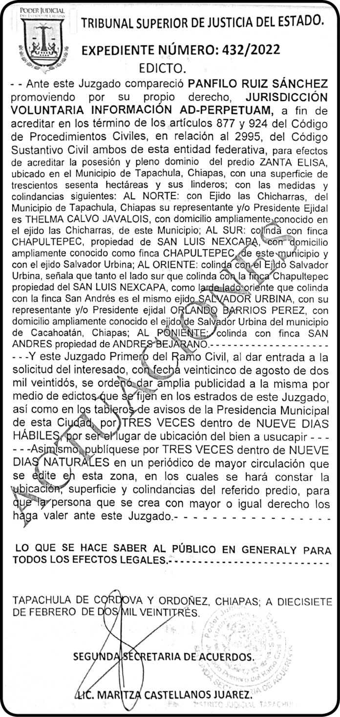 InicioAviso EficazEdictosEdicto 432-2022 Edictos Edicto 432-2022 5 marzo, 2023 0 1311 Cuota FacebookTwitterPinterestWhatsAppEmail Cuota FacebookTwitterPinterestWhatsAppEmail Artículo anteriorEdicto 29-2023Artículo siguiente“Bardo” la Gran Perdedora de los Premios Canacine RELATED ARTICLES Edictos Edicto 556-2023 11 octubre, 2023 Edictos Aviso Luvia Perez Galvez 11 octubre, 2023 Edictos Edicto 1174-2021 10 octubre, 2023 EL ORBE AL MOMENTO: Poder Judicial del Estado impone 50 años de prisión a responsable del delito de Secuestro Agravado Al Instante staff - 17 diciembre, 2025 0 El Poder Judicial del Estado de Chiapas, a través de un Tribunal de Enjuiciamiento, dictó sentencia condenatoria en contra de Edwin “N” por el... Leer más Aprehenden a presunto pederasta y objetivo prioritario: FGE Al Instante staff - 17 diciembre, 2025 0 • Por hechos ocurridos en Comitán, en mayo de 2023 Los Elementos de la Agencia de Investigación e Inteligencia Ministerial y del grupo Fuerza de Reacción... Leer más Olimpiada Nacional 2026 CONADE Al Instante staff - 17 diciembre, 2025 0 Leer más Cargar más MAS Popular Poder Judicial del Estado impone 50 años de prisión a responsable del delito de Secuestro Agravado 17 diciembre, 2025 Aprehenden a presunto pederasta y objetivo prioritario: FGE 17 diciembre, 2025 Olimpiada Nacional 2026 CONADE 17 diciembre, 2025 Denuncian Abusos en el Cobro de Tarifas en Taxis de Tapachula 17 diciembre, 2025 Cargar más