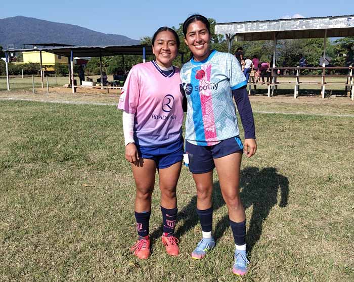 Rivales dentro del terreno de juego y excelentes amigas fuera de ellas:Angelita Lucero, de Tuxtla Chico, y Valeria «Cabrita», de Huixtla, compañeras del campeonísimo equipo guadalupano que dirigen el tapachulteco Raúl Muñoz y Lupita Chilel.EL ORBE/Virgilio Cruz