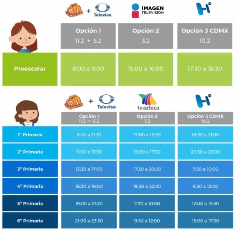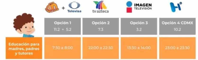 Para educación básica que comprende Preescolar, Primaria y Secundaria se transmitirán por los siguientes canales 11.2, 5.2, 7.3 y 3.2 a través de Canal Once, Televisa, Tv Azteca, Ingenio Tv e Imagen Televisión.