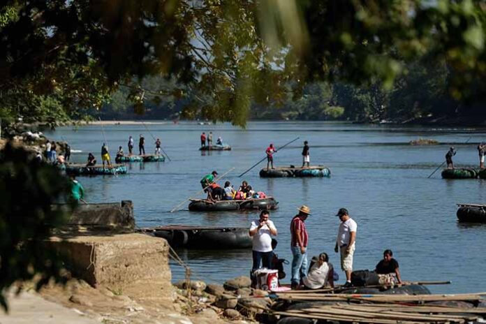 Frente a la frontera mexicana, a unos 150 metros, montados en una balsa, dos jóvenes matrimonios de venezolanos, cada uno con un bebé, festejan tras subirse para cruzar al límite guatemalteco antes de intentar llegar a Estados Unidos.