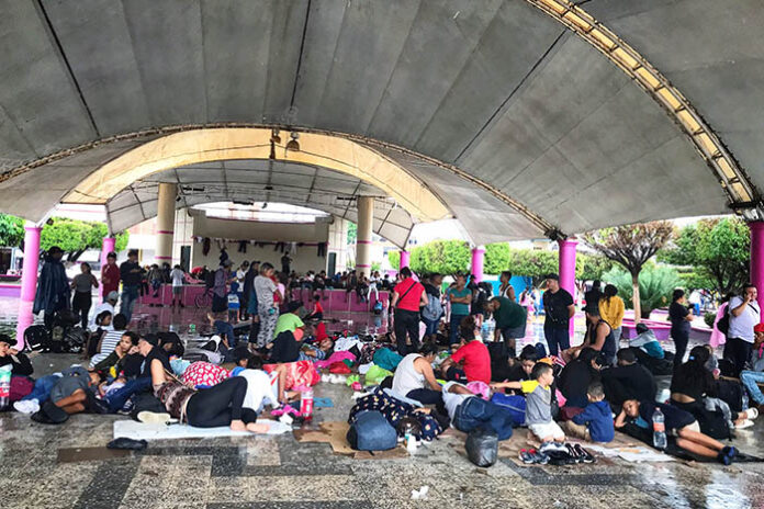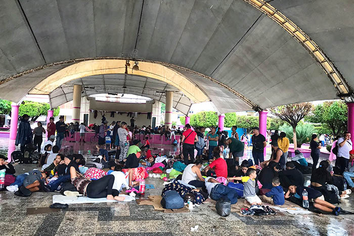 Durante los últimos días han caído una serie de tormentas sobre Chiapas y los Estados en el sur del país, sin ninguna protección para los cientos de migrantes que se concentran bajo el techo agujereado del parque central “Miguel Hidalgo”, por el que se filtran pequeñas goteras que se estrellan con el suelo o sobre el cuerpo de los migrantes.