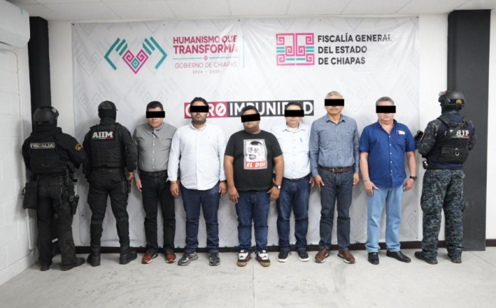 Y es que, la Fiscalía General del Estado y la Secretaría de Seguridad del Pueblo ejecutaron órdenes de aprehensión en contra de seis servidores públicos del Colegio de Bachilleres de Chiapas, como presuntos responsables del delito de extorsión agravada, cometido en perjuicio de una persona del sexo femenino de identidad reservada, en Tuxtla Gutiérrez, Chiapas.