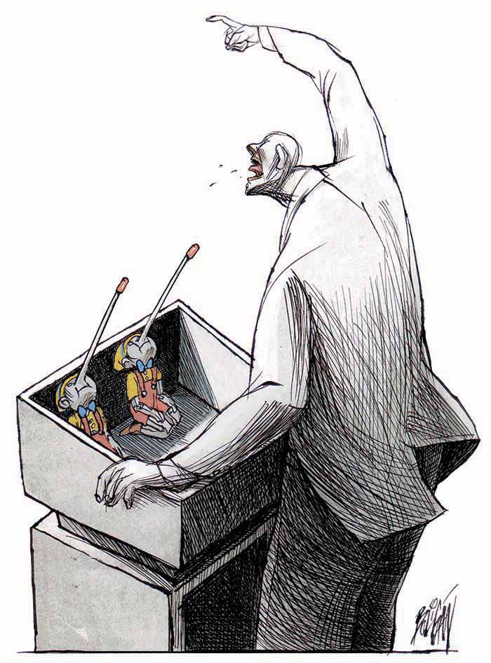 El Senador ambulatorio, de saco de lana, sin gracia y con maña, hoy muerde su lengua, pues ya no le sirve su verbo mentiroso que nadie percibe.