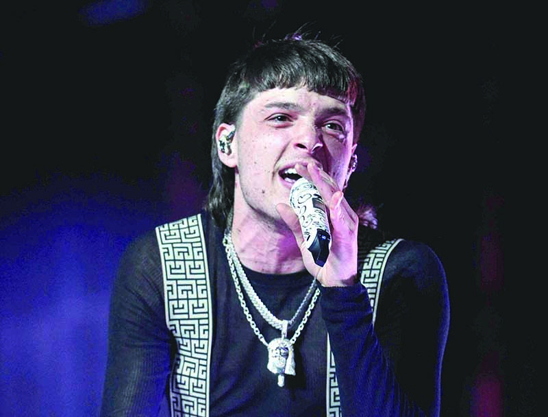 Peso Pluma, uno de los más nominados y quien fue distinguido con el Premio Vanguardia, llegó vestido de esmoquin, con la camisa abierta y un lazo desamarrado. En su brazo estaba su pareja y también artista Kenia OS, quien llevaba un body de pedrería y una falda de red negros, al que le dio color con una boa azul rey.