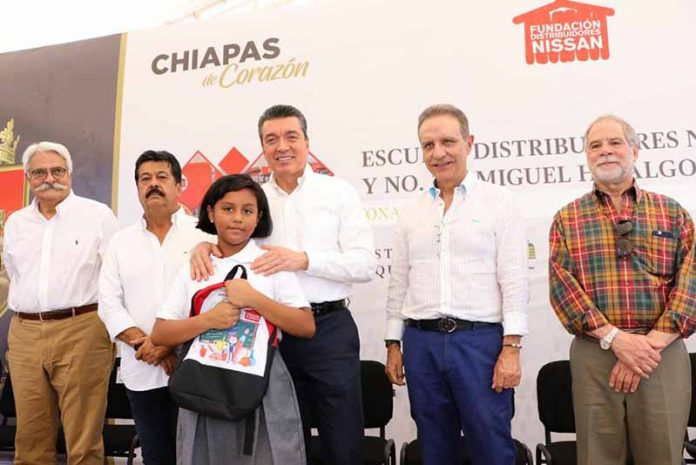 Acompañado del presidente de Grupo Farrera, Rómulo Farrera Escudero y el director general de la Asociación Nacional de Distribuidores de Automóviles Nissan A.C. (Andanac), Carlos Escoto, el mandatario destacó el apoyo de la Fundación Distribuidores Nissan para hacer realidad que más estudiantes cuenten con espacios seguros donde estudiar, como es el caso de los planteles educativos Distribuidores Nissan 101 “Benito Juárez García”, y 102 “Miguel Hidalgo y Costilla”, ubicados en la localidad El Manguito y en la cabecera municipal, respectivamente.
