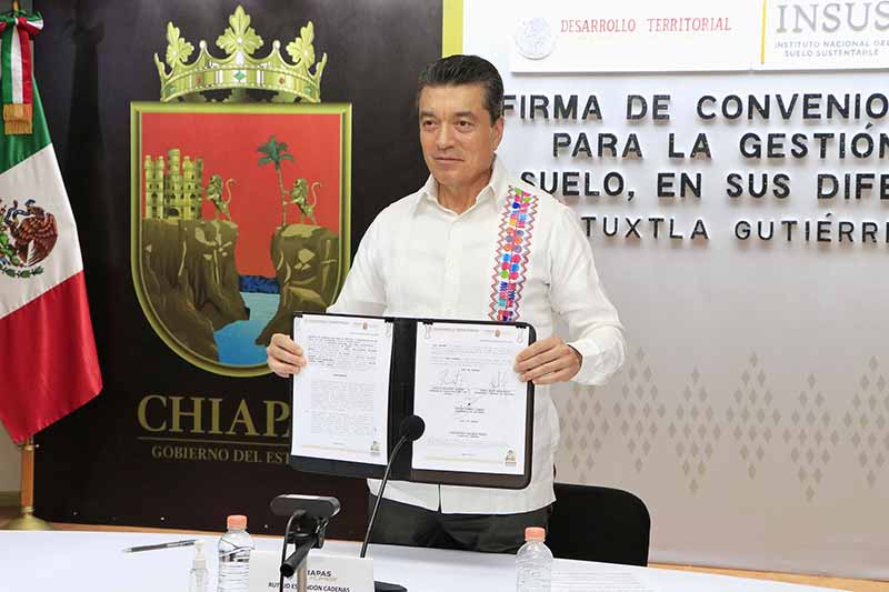 Tuxtla Gutiérrez.- Durante la firma del Convenio de Colaboración para la Gestión y Regularización del Suelo, en sus diferentes tipos y modalidades, con el director del Instituto Nacional del Suelo Sustentable (Insus), José Alfonso Iracheta Carroll, el gobernador Rutilio Escandón Cadenas enfatizó que de esta manera se fomenta el acceso a una vivienda digna y se fortalecen acciones con el propósito de poner orden en la tenencia de la tierra y los asentamientos humanos.