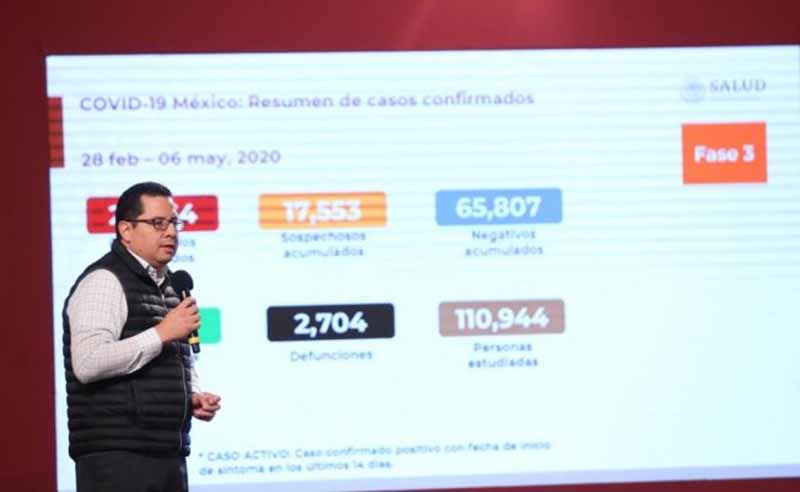 Ciudad de México, 6 de mayo.-México acumula, al corte de este 6 de mayo, 2 mil 704 muertes por Covid-19, con 27 mil 634 casos de contagios confirmados de coronavirus, según informan autoridades de la Secretaría de Salud.