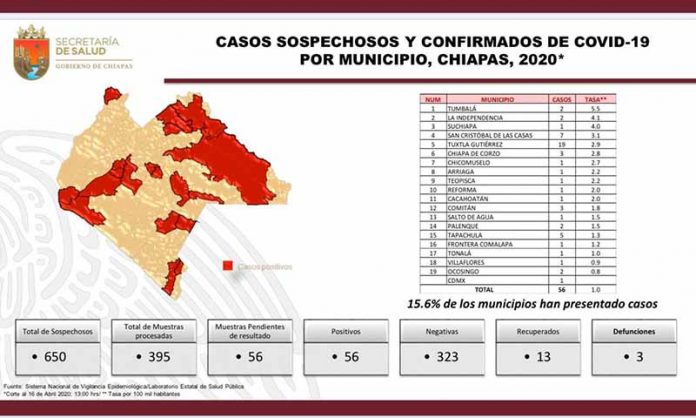 Tuxtla Gutiérrez, Chiapas; 14 de Mayo de 2020.- Con la confirmación de 56 casos nuevos y tres defunciones en las últimas horas, el estado de Chiapas llega a 505 pacientes positivos y 38 decesos en lo que va de la pandemia por Coronavirus COVID-19, con fecha de corte al 14 de Mayo, dio a conocer el secretario de Salud, José Manuel Cruz Castellanos.