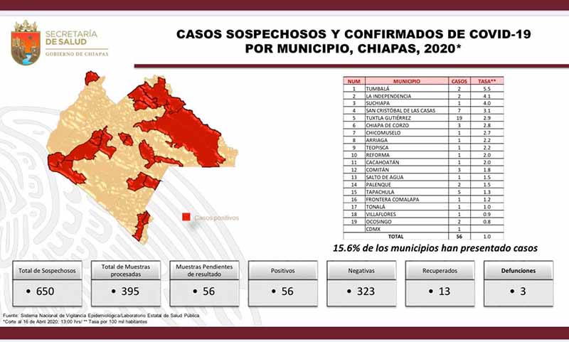 En conferencia de prensa, el funcionario estatal informó que los nuevos casos por municipio se distribuyen de la siguiente manera: Tuxtla Gutiérrez, 19; Tapachula, nueve; Palenque, cuatro; Benemérito de las Américas, Huixtla y San Cristóbal de Las Casas, tres cada uno; Arriaga y Huehuetán, dos cada uno; y Acala, Cacahoatán, Chiapa de Corzo, Cintalapa, Comitán, La Grandeza, Motozintla, San Fernando, Tonalá, Tuxtla Chico y Venustiano Carranza, un caso cada uno.