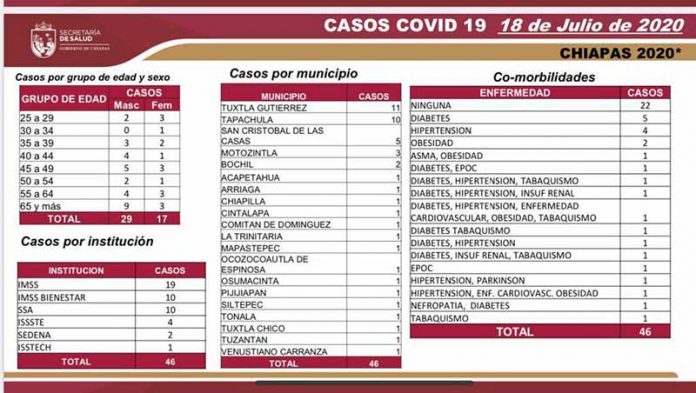 La dependencia estatal detalla que los casos recientes, registrados en 29 hombres y 17 mujeres, se presentaron en los siguientes municipios: Tuxtla Gutiérrez, 11; Tapachula, 10; San Cristóbal de Las Casas, cinco; Motozintla, tres; Bochil, dos; y Acapetahua, Arriaga, Chiapilla, Cintalapa, Comitán, La Trinitaria, Mapastepec, Ocozocoautla, Osumacinta, Pijijiapan, Siltepec, Tonalá, Tuxtla Chico, Tuzantán y Venustiano Carranza, un caso cada uno.