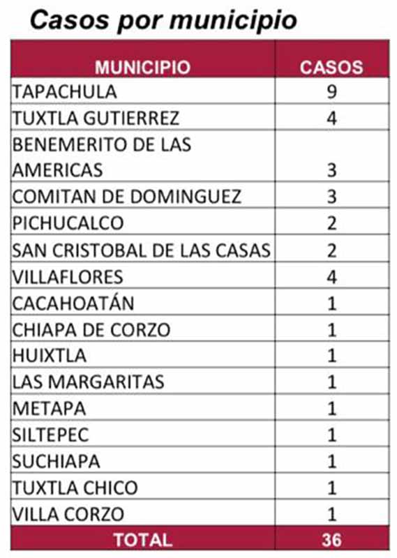 Los casos nuevos se registraron en los siguientes municipios: Tapachula, nueve; Tuxtla Gutiérrez y Villaflores, cuatro cada uno; Benemérito de las Américas y Comitán, tres cada uno; Pichucalco y San Cristóbal de Las Casas, dos cada uno; y Cacahoatán, Chiapa de Corzo, Huixtla, Las Margaritas, Metapa de Domínguez, Siltepec, Suchiapa, Tuxtla Chico y Villa Corzo, un caso cada uno.