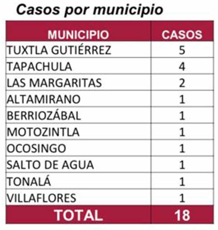 Los casos recientes se presentaron en los siguientes municipios: Tuxtla Gutiérrez, cinco; Tapachula, cuatro; Las Margaritas, dos; y en Altamirano, Berriozábal, Motozintla, Ocosingo, Salto de Agua, Tonalá y Villaflores, un caso cada uno.