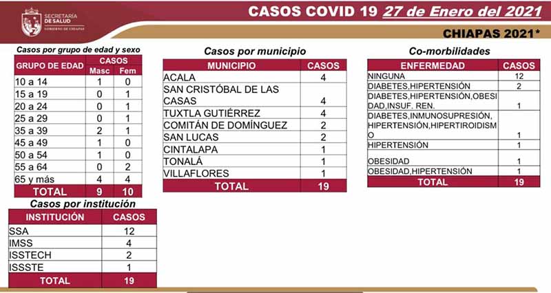 Los casos nuevos se presentaron en los municipios siguientes: Acala, San Cristóbal de Las Casas y Tuxtla Gutiérrez, cuatro cada uno; Comitán y San Lucas, dos cada uno; y Cintalapa, Tonalá y Villaflores, un caso cada uno.