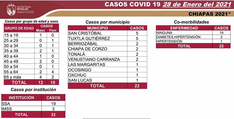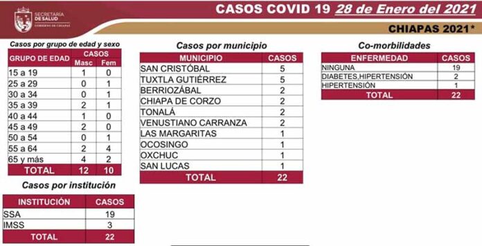 Tuxtla Gutiérrez, Chiapas; 28 de Enero de 2021.- En las últimas horas, 10 municipios de la entidad reportaron 22 casos positivos de COVID-19, por lo que el saldo actual de la pandemia llega a 7 mil 819 contagios, informa la Secretaría de Salud de Chiapas.