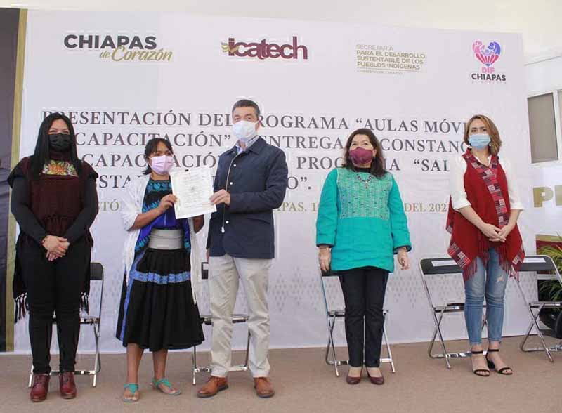 Tuxtla Gutiérrez.- Desde San Cristóbal de Las Casas, se puso en marcha el Programa Aulas Móviles de Capacitación, donde el gobernador Rutilio Escandón Cadenas informó que a través de este plan se busca brindar a la población de comunidades apartadas, conocimientos que les permitan autoemplearse, integrarse al sector productivo y mejorar su calidad de vida.