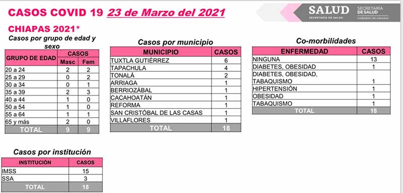 Tuxtla Gutiérrez, Chiapas; 23 de marzo de 2021.- La Secretaría de Salud de Chiapas da a conocer que en las últimas horas se notificaron 18 casos positivos de COVID-19, sin reportarse defunciones.