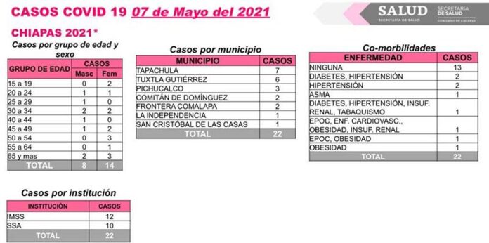 Tuxtla Gutiérrez, Chiapas; 7 de Mayo de 2021.- La Secretaría de Salud del Estado informa el registro de 22 casos positivos y dos defunciones de COVID-19 en las últimas horas.