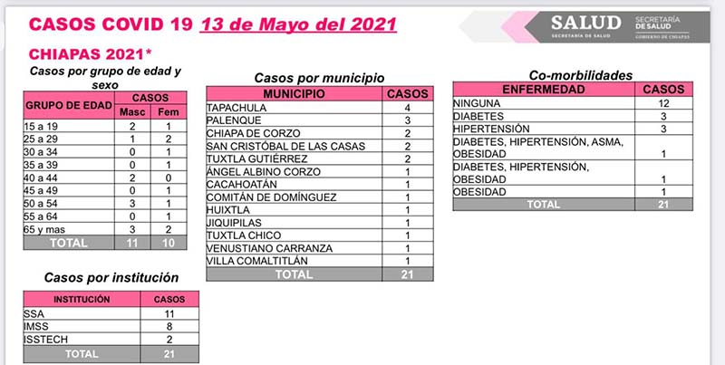 Tuxtla Gutiérrez, Chiapas; 13 de Mayo de 2021.- El Laboratorio Estatal de Salud Pública confirmó 21 casos de COVID-19 en las últimas horas, de los cuales el 43 por ciento de los pacientes presenta enfermedades adicionales, como dato de morbilidad asociada.