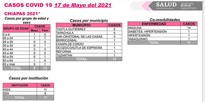 Tuxtla Gutiérrez, Chiapas; 17 de Mayo de 2021.- Chiapas cumple 96 horas sin registrar fallecimientos por COVID-19, mientras que en incidencia de casos se notificaron 17 contagios el último día, informa la Secretaría de Salud estatal.