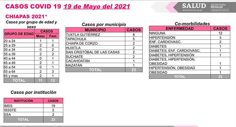 Tuxtla Gutiérrez, Chiapas; 19 de mayo de 2021.- El informe diario sobre la transmisión de COVID-19 en la entidad indica que en las últimas horas se confirmaron 23 casos.