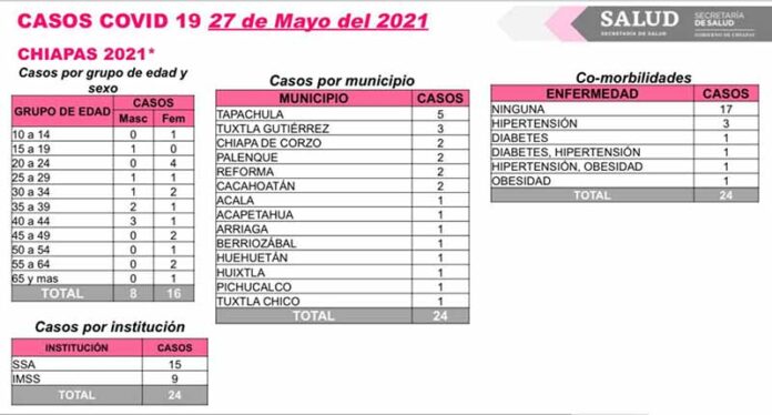 Tuxtla Gutiérrez, Chiapas; 27 de mayo de 2021.- El Laboratorio Estatal de Salud Pública confirmó en las últimas horas 24 casos positivos de COVID-19. En cuanto a los decesos por esta enfermedad, la Secretaría de Salud de Chiapas comunica el reporte de una muerte en el último día.