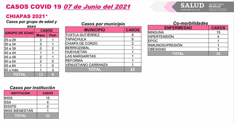 Tuxtla Gutiérrez, Chiapas; 07 de Junio de 2021.- En las últimas horas se confirmaron 22 casos positivos de COVID-19, de los cuales siete pacientes presentan factores de riesgo, informa la Secretaría de Salud del Estado.