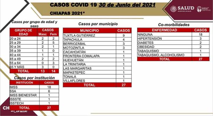 Tuxtla Gutiérrez, Chiapas; 30 de junio de 2021.- El estado de Chiapas cierra el mes de junio con la notificación de 27 contagios de COVID-19 en personas mayores de 20 años de edad y un fallecimiento por esta enfermedad, en las últimas horas, informa la Secretaría de Salud estatal.
