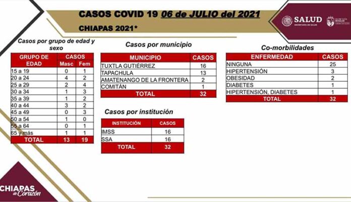 Tuxtla Gutiérrez, Chiapas; 06 de Julio de 2021.- En las últimas horas se confirmaron 32 casos positivos y un fallecimiento por COVID-19 en el Estado de Chiapas, informa la Secretaría de Salud estatal.