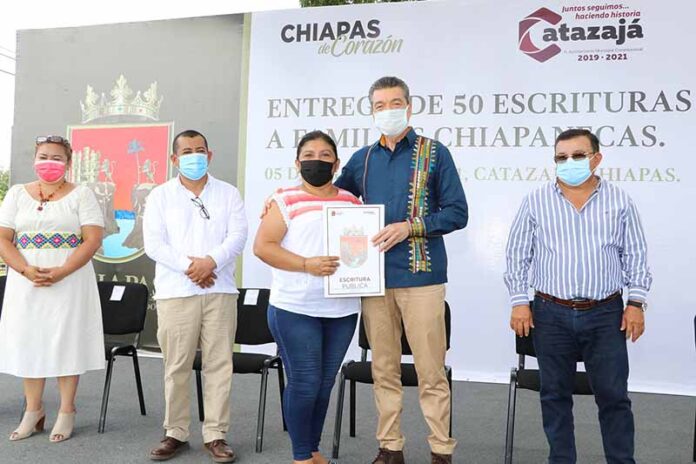 Tuxtla Gutiérrez.- Tras 20 años de lucha, un total de 50 familias del Fraccionamiento “La Laguna”, en el municipio de Catazajá, fueron beneficiadas con escrituras públicas que recibieron de manos del gobernador Rutilio Escandón Cadenas, quien celebró que esta demanda añeja hoy esté cumplida, pues les dará certeza jurídica sobre su patrimonio, para que nadie pueda arrebatárselos.