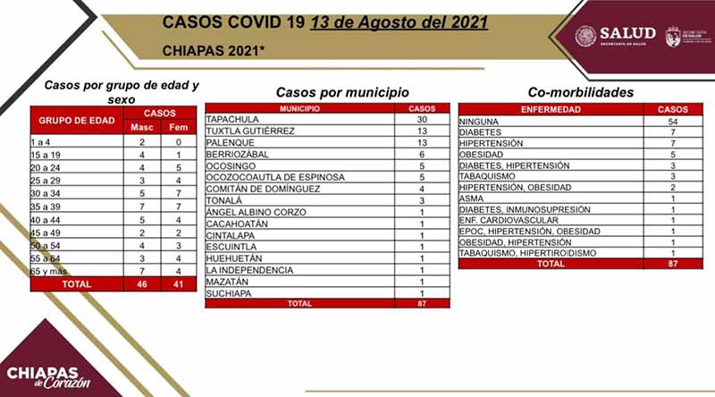 Tuxtla Gutiérrez, Chiapas; 13 de Agosto de 2021.- De acuerdo con las pruebas analizadas por el Laboratorio Estatal de Salud Pública en las últimas horas, se confirmaron 87 casos positivos de COVID-19 en 16 municipios de la entidad.