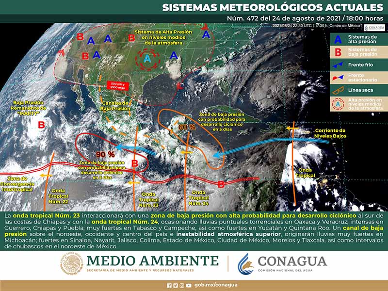 Tapachula, Chiapas; 24 de Agosto del 2021.- Autoridades de Protección Civil alertaron sobre un sistema de baja presión ubicado en el Océano Pacifico frente a las costas de Oaxaca con alta probabilidad de formación ciclónica que dejará lluvias muy fuertes a intensas en la región Soconusco, para las próximas horas.