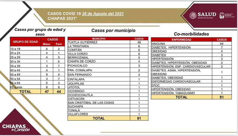 Tuxtla Gutiérrez, Chiapas; 26 de Agosto de 2021.- La Secretaría de Salud del Estado da a conocer la confirmación de 91 casos de COVID-19 en las últimas horas, en personas de 15 años en adelante, de las cuales el 30 por ciento cursa con comorbilidades.