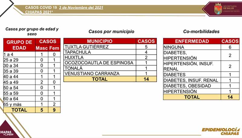 Tuxtla Gutiérrez, Chiapas; 03 de noviembre de 2021.- El panorama epidemiológico de COVID-19 en las últimas horas registra 14 contagios nuevos en la entidad, sin que se hayan reportado fallecimientos, con lo que el indicador de mortalidad cumple cuatro días sin variaciones, da a conocer la Secretaría de Salud de Chiapas.