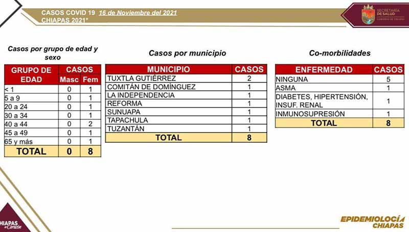 Los casos recientes se presentaron en los siete municipios siguientes: Tuxtla Gutiérrez con dos y Comitán, La Independencia, Reforma, Sunuapa, Tapachula y Tuzantán con un contagio cada uno.