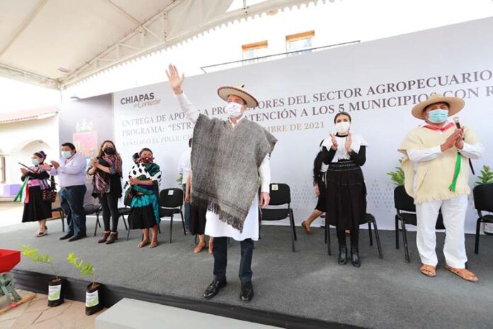 El gobernador Rutilio Escandón Cadenas encabezó la entrega de apoyos agrícolas y pecuarios del Programa Estrategia de Atención a los Cinco Municipios con Mayor Rezago Social, que en esta ocasión benefició a habitantes de Santiago El Pinar, Mitontic y Chanal, donde destacó que este gobierno prioriza la atención de las necesidades más sensibles de los pueblos indígenas, a fin de contribuir al bienestar, la seguridad alimentaria y el crecimiento del índice de desarrollo humano.