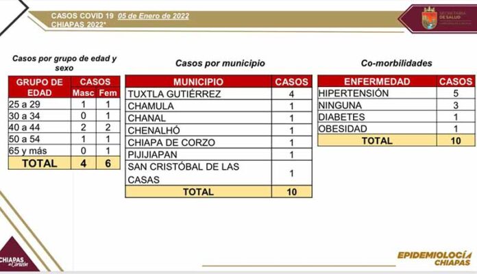 Tuxtla Gutiérrez, Chiapas; 05 de enero de 2021.- La Secretaría de Salud estatal informa que en las últimas horas se detectaron 10 casos positivos de COVID-19 en personas mayores de edad de siete municipios de Chiapas.