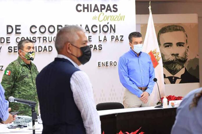 Durante la Mesa de Seguridad, el gobernador Rutilio Escandón Cadenas informó que en Chiapas se encuentran activos 65 centros de vacunación y las brigadas continúan recorriendo las casas y los negocios para avanzar en el proceso de inmunización, por lo que insistió en el llamado a la población a vacunarse y protegerse ante el COVID-19, especialmente por la presencia de la cepa ómicron, que es altamente contagiosa.