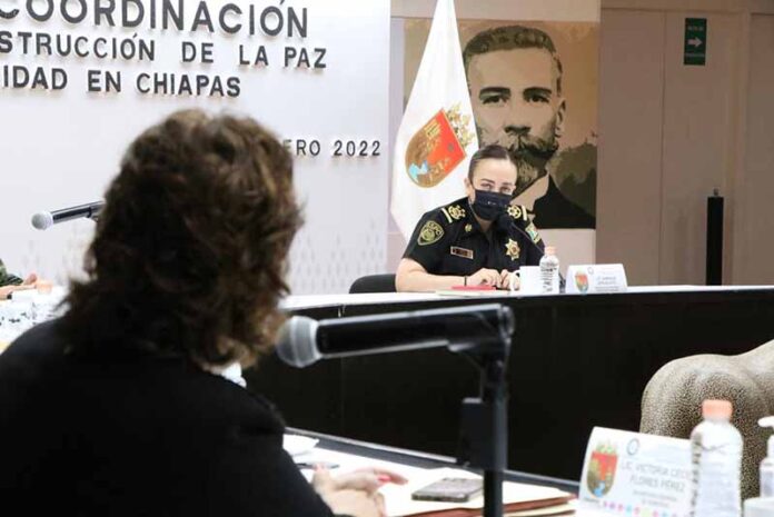 Tuxtla Gutiérrez, Chiapas.- En representación del gobernador Rutilio Escandón Cadenas, la secretaria de Seguridad y Protección Ciudadana, Gabriela Zepeda Soto, coordinó la Mesa de Seguridad Estatal en Palacio de Gobierno, en la cual se dio cuenta de las acciones que se llevan a cabo para garantizar la seguridad, la salud y el bienestar de las familias chiapanecas, de manera especial se informó de los operativos disuasivos para combatir la incidencia delictiva que afectan al sector transportista en Tapachula.