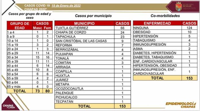 Tuxtla Gutiérrez, Chiapas; 18 de Enero de 2022.- El informe diario sobre la transmisión de COVID-19 en la entidad arroja que en las últimas horas se registraron 153 casos nuevos en todos los grupos de edad y la mayoría de ellos en las ciudades de Tuxtla Gutiérrez, Chiapa de Corzo y Tapachula, da a conocer la Secretaría de Salud de Chiapas.