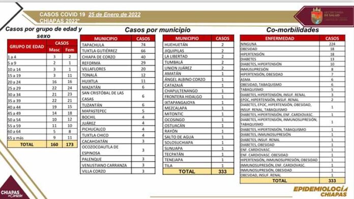 Tuxtla Gutiérrez, Chiapas; 25 de enero de 2022.- En las últimas horas se registraron 333 contagios de COVID-19 en 42 municipios de la entidad, en personas de los diferentes grupos de edad, de las cuales el 67 por ciento no tiene factores de riesgo, da a conocer la Secretaría de Salud de Chiapas.