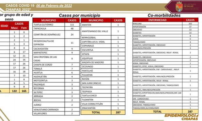 Tuxtla Gutiérrez, Chiapas; 06 de Febrero de 2022.- En las últimas horas se reportaron 287 contagios de COVID-19 en 40 municipios de Chiapas, uno de ellos detectado en un bebé y 10 identificados en menores de uno a 14 años de edad, informa la Secretaría de Salud estatal.