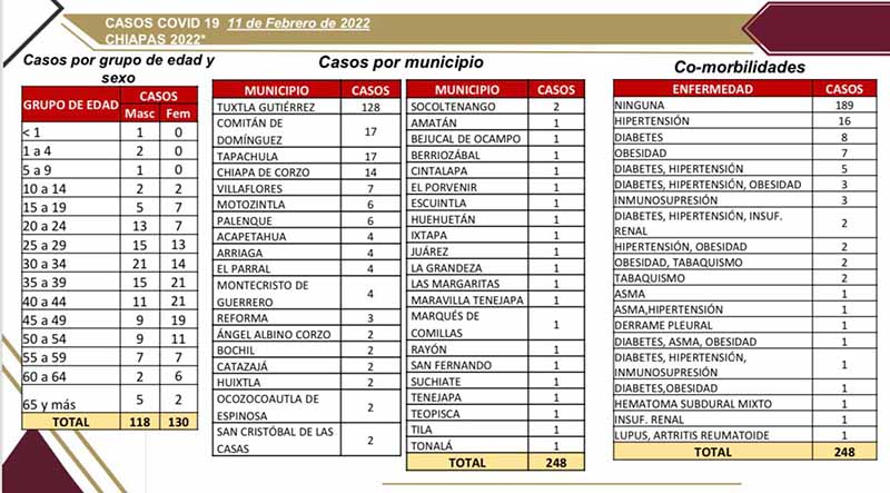 Tuxtla Gutiérrez, Chiapas; 11 de Febrero de 2022.- El Laboratorio Estatal de Salud Pública reportó en las últimas horas 248 pruebas positivas de COVID-19, el 52 por ciento de ellas en la Ciudad de Tuxtla Gutiérrez (128 casos).